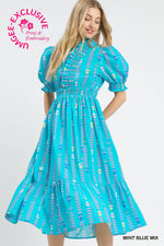 Umgee Vibrant Ruffle Smocked Midi Dress In Mint Blue Mix